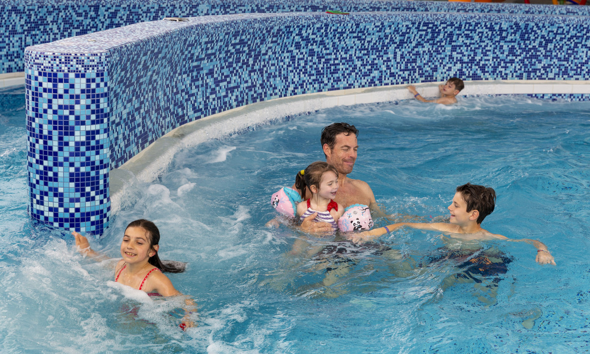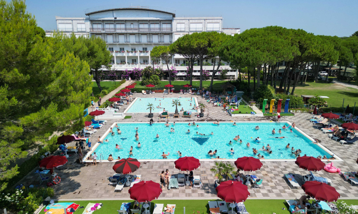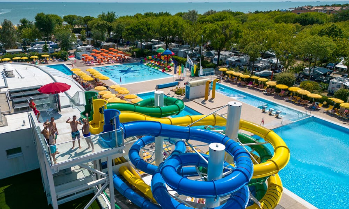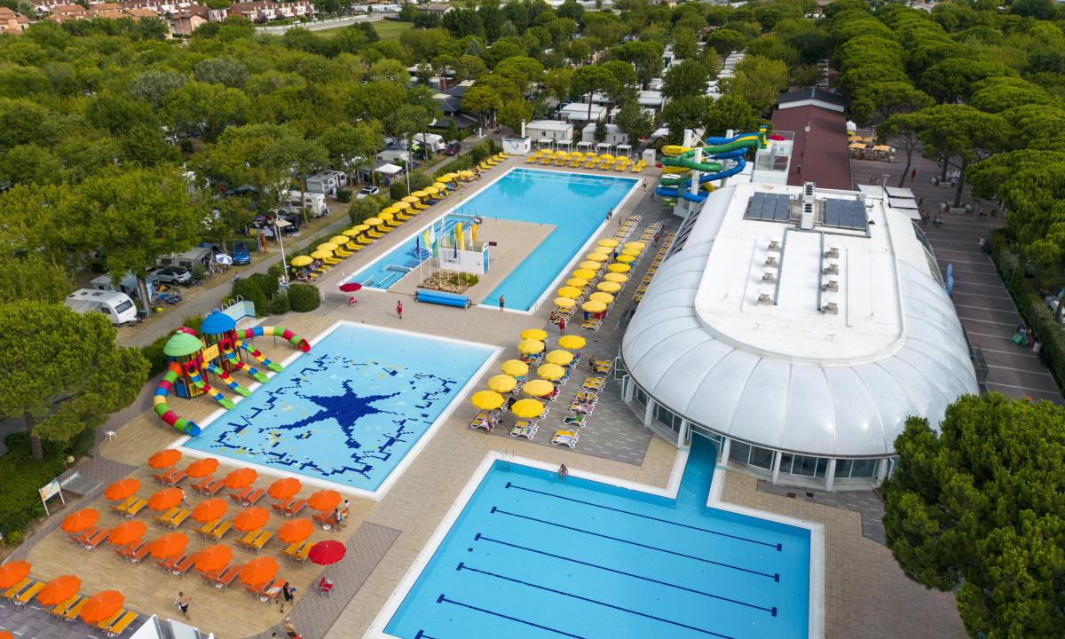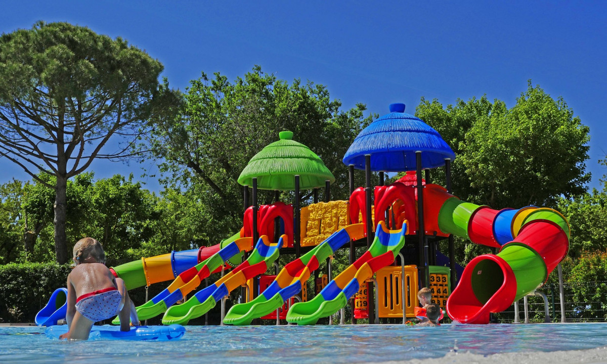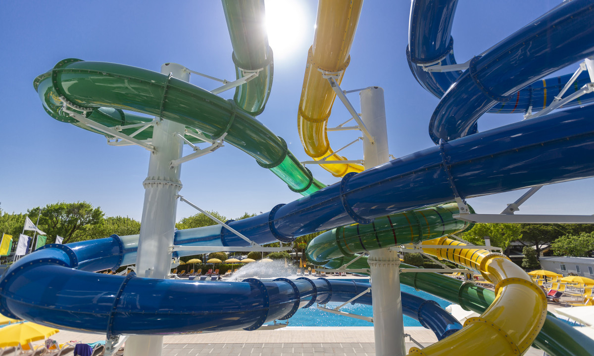 Prostorný bazénový komplex s dětskými bazény a skluzavkami