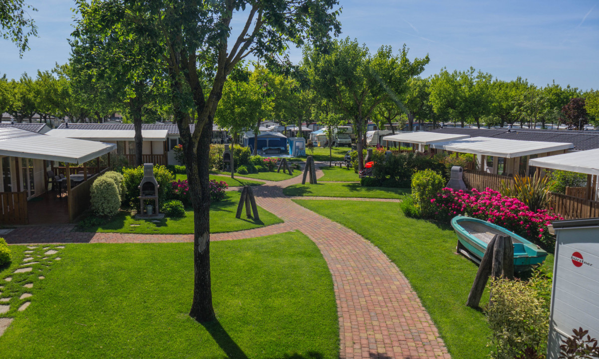 Krásně udržovaný kemp se zahradami a květinovými záhony