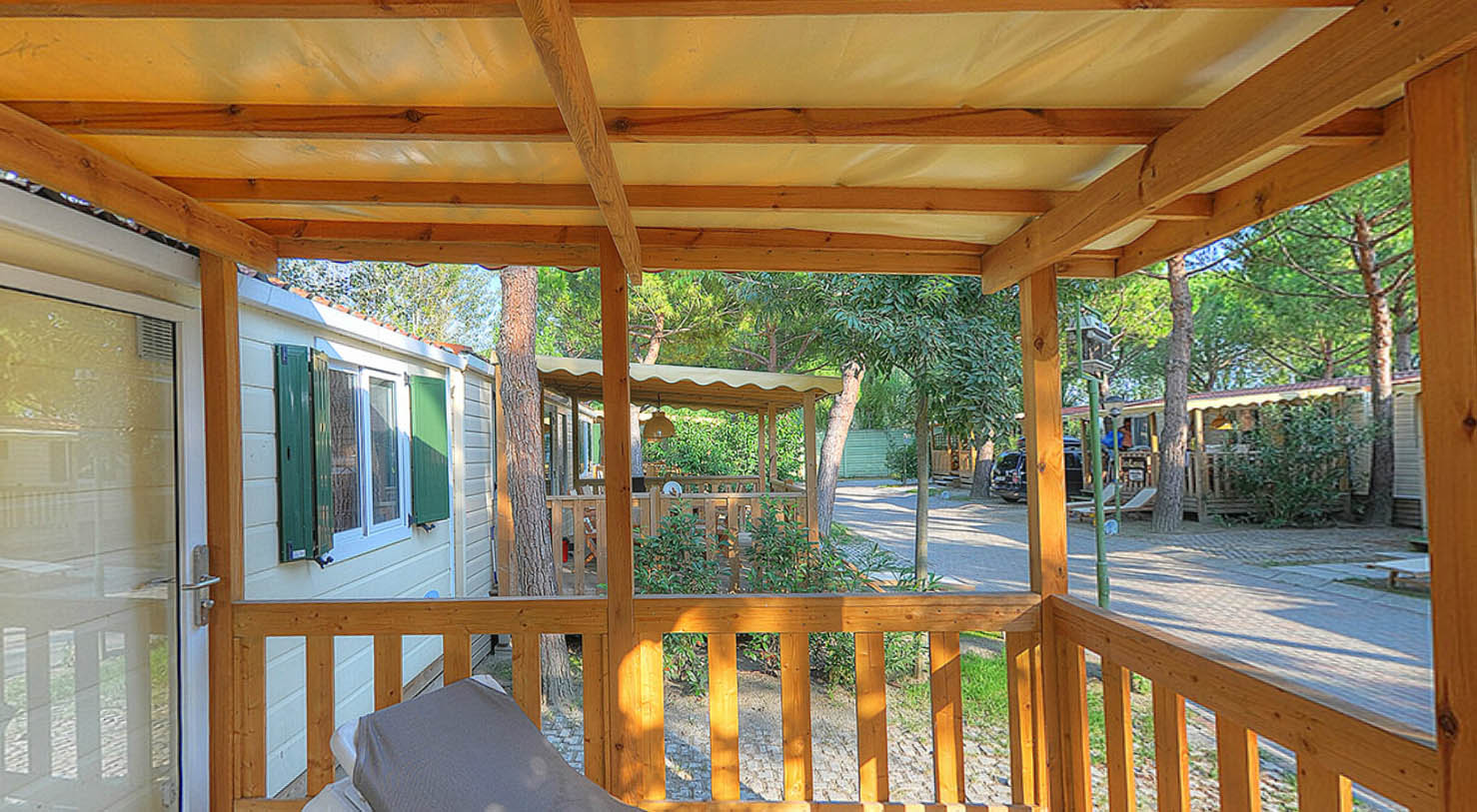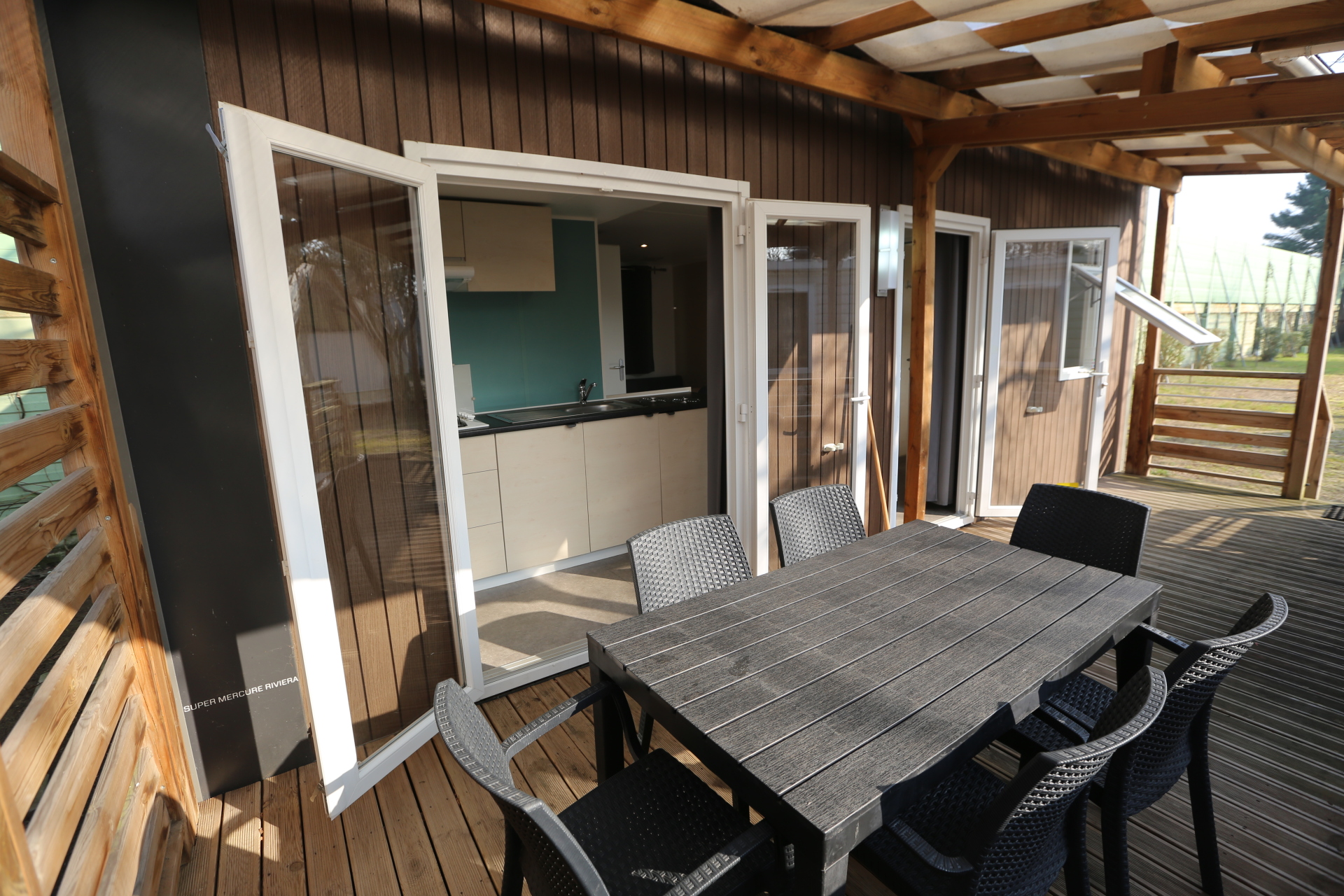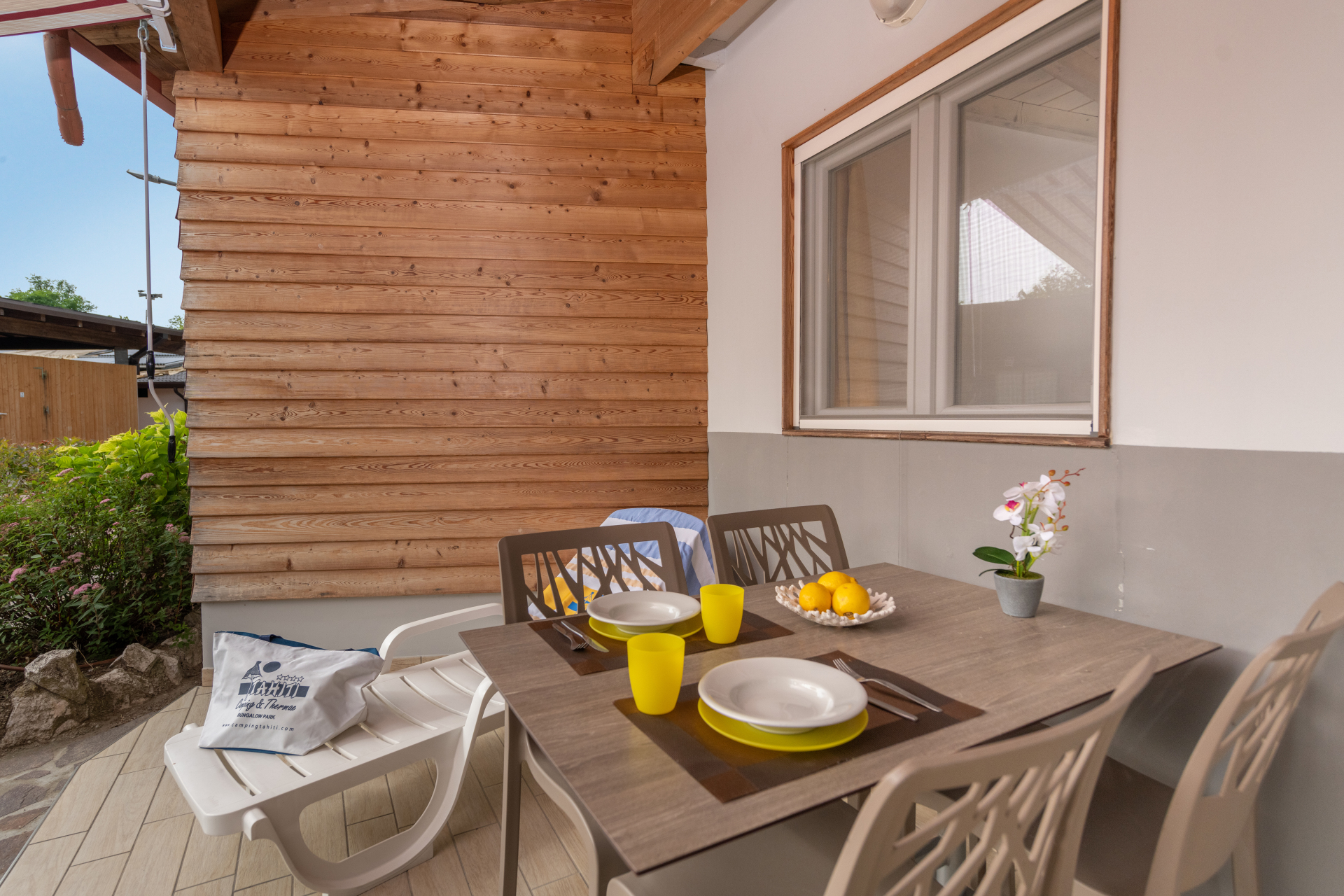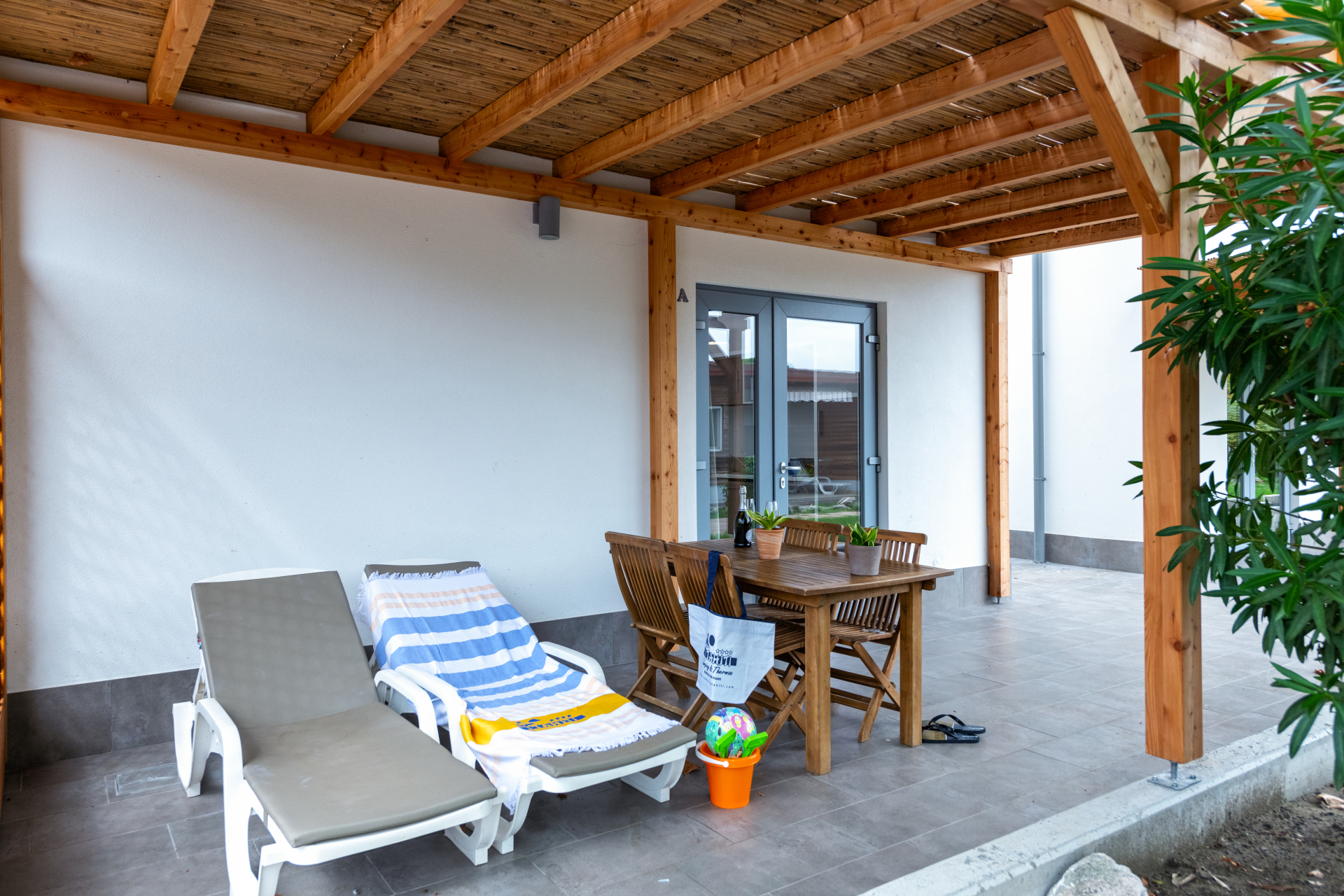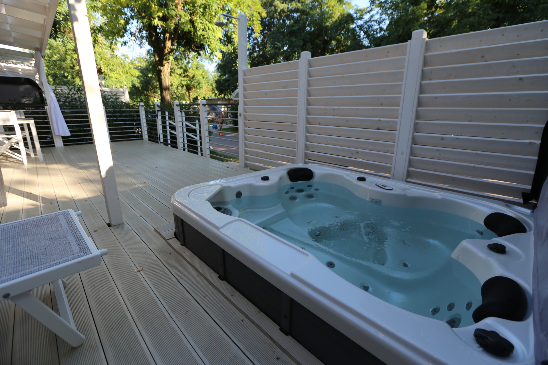 - Holzterrasse, mit Markise