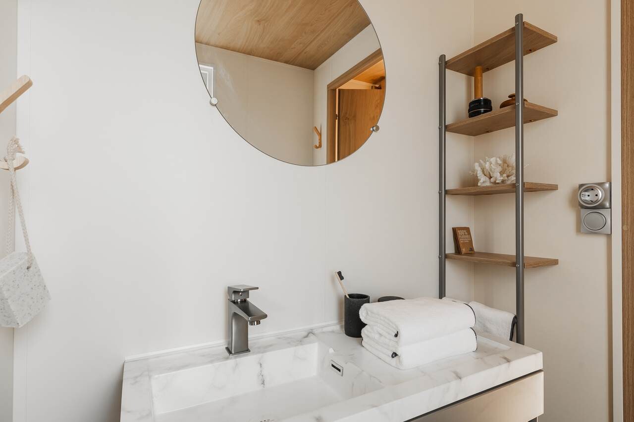 Die Stellplätze des Campingplatzes sind mit reichlich Grün gesegnet, das die Natur fördert und einen ruhigen und privaten Ort zum Verweilen bietet. Unsere modernen Mobilheime schmiegen sich an einladende Stellplätze und verfügen über geräumige Wohnbereiche, nützliche Annehmlichkeiten und eine Sonnenterrasse.