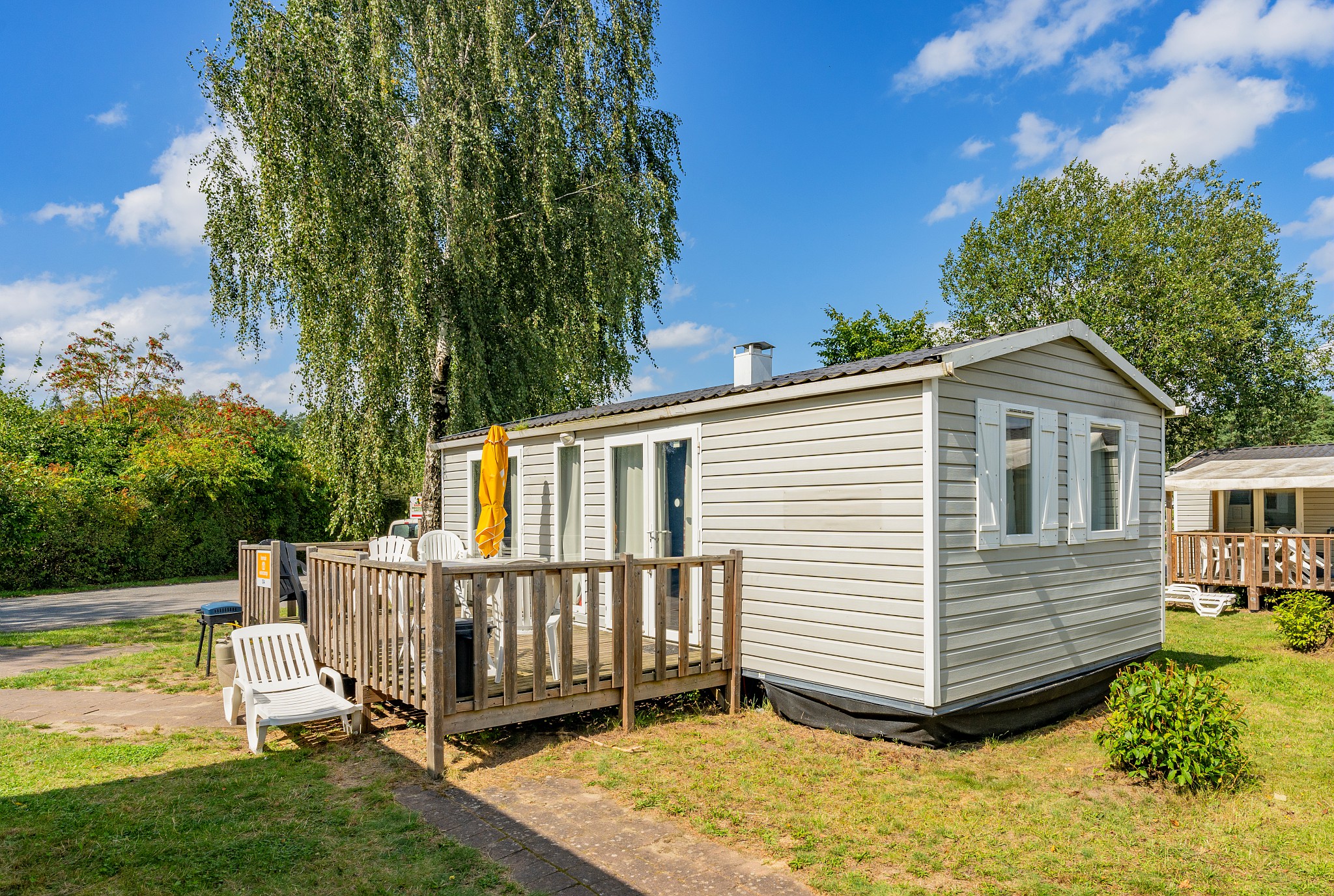 Unsere modernen Mobilheime mit großartiger Ausstattung, Sonnenterrasse und in einigen Modellen mit Klimaanlage machen unsere Unterkünfte zu einem perfekten Zuhause fern von zu Hause. Genießen Sie die friedliche Atmosphäre, die unsere geräumigen und grünen Stellplätze auszeichnet.