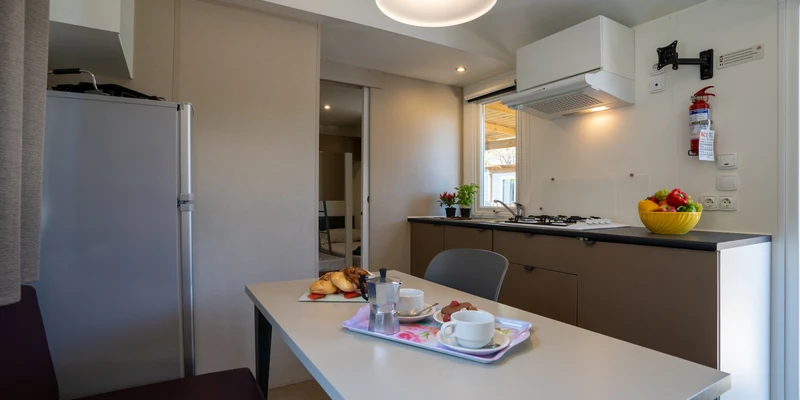 Gibt es ein Schwimmbad? Ohne Zweifel eine besonders wichtige Frage für die Kinder. Und ja, natürlich gibt es auch einen Pool! Übrigens mit einer tollen Wasserrutsche. Neben einem Schwimmbecken für Erwachsene ist auch ein spezielles Kinderbecken vorhanden. Am Rand aufgestellte Liegestühle laden zum Sonnenbaden und Relaxen ein. Es sei denn, Sie möchten sich lieber an der Animation beteiligen oder Ihre Kinder in den Miniclub begleiten. Gegen Abend können Sie noch eben im Supermarkt einkaufen, um anschließend in der Küche Ihres Mobilheims leckere Mahlzeiten zu kochen. Alternativ dazu können Sie natürlich auch im Restaurant mit Pizzeria Essen gehen oder Gerichte zum Mitnehmen holen.