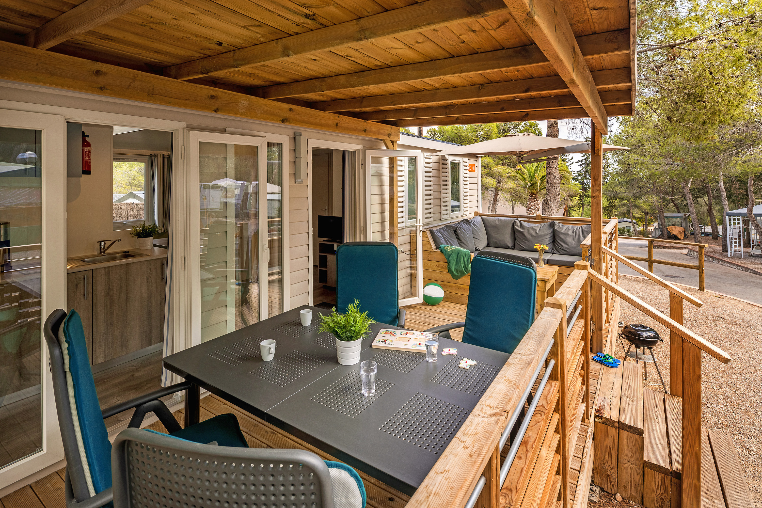 - Ebenerdige oder kleine integrierte Holzterrasse, mit Sonnenschirm oder Pavillon