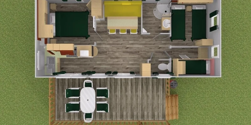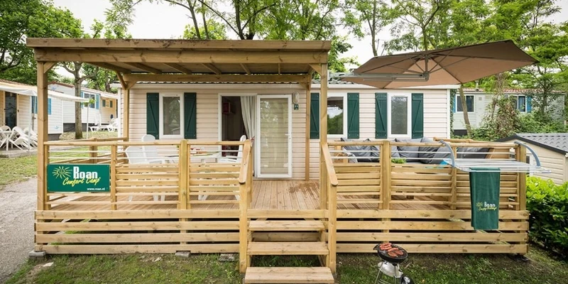 - Planta baja o pequeña terraza de madera integrada, Con parasol o glorieta