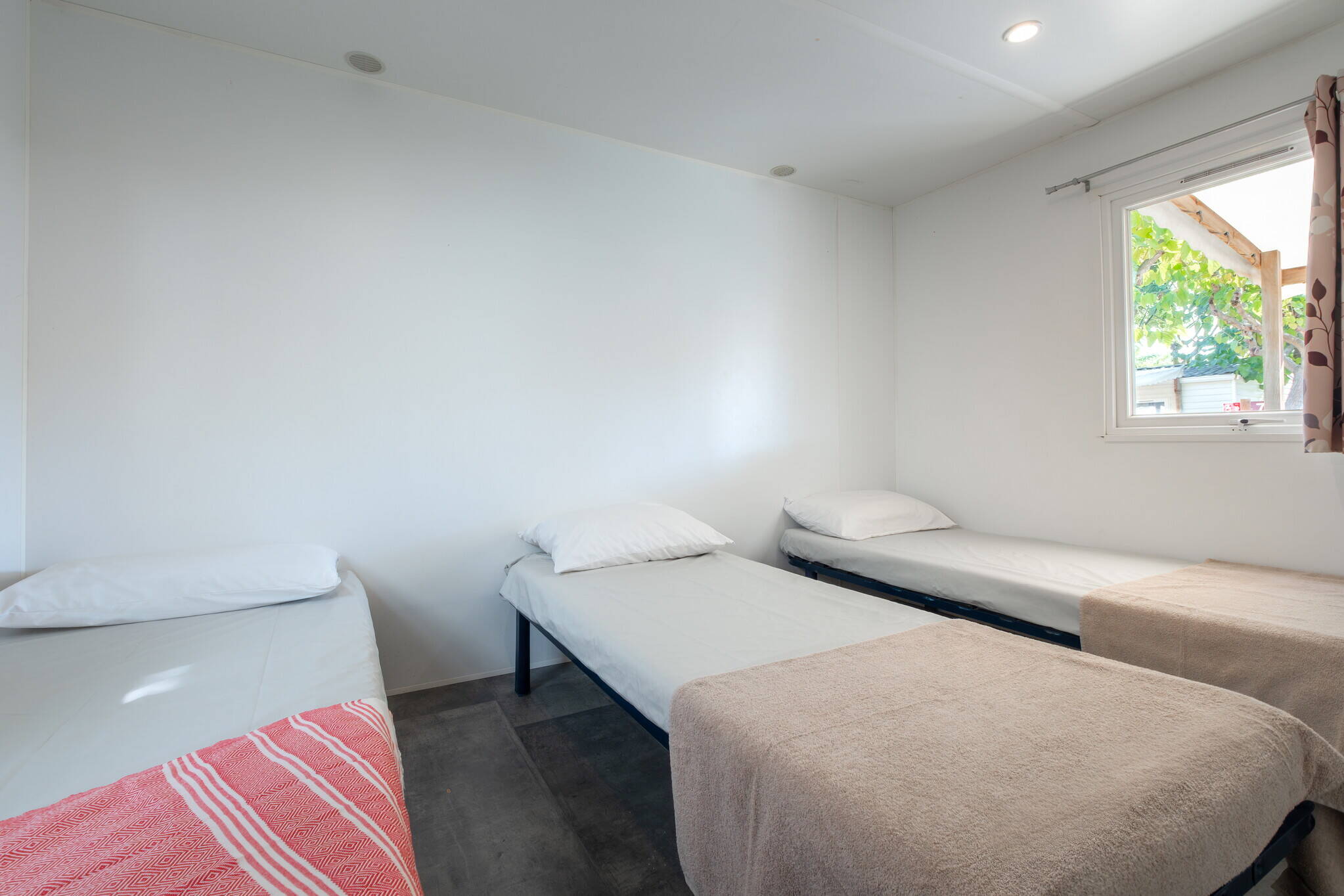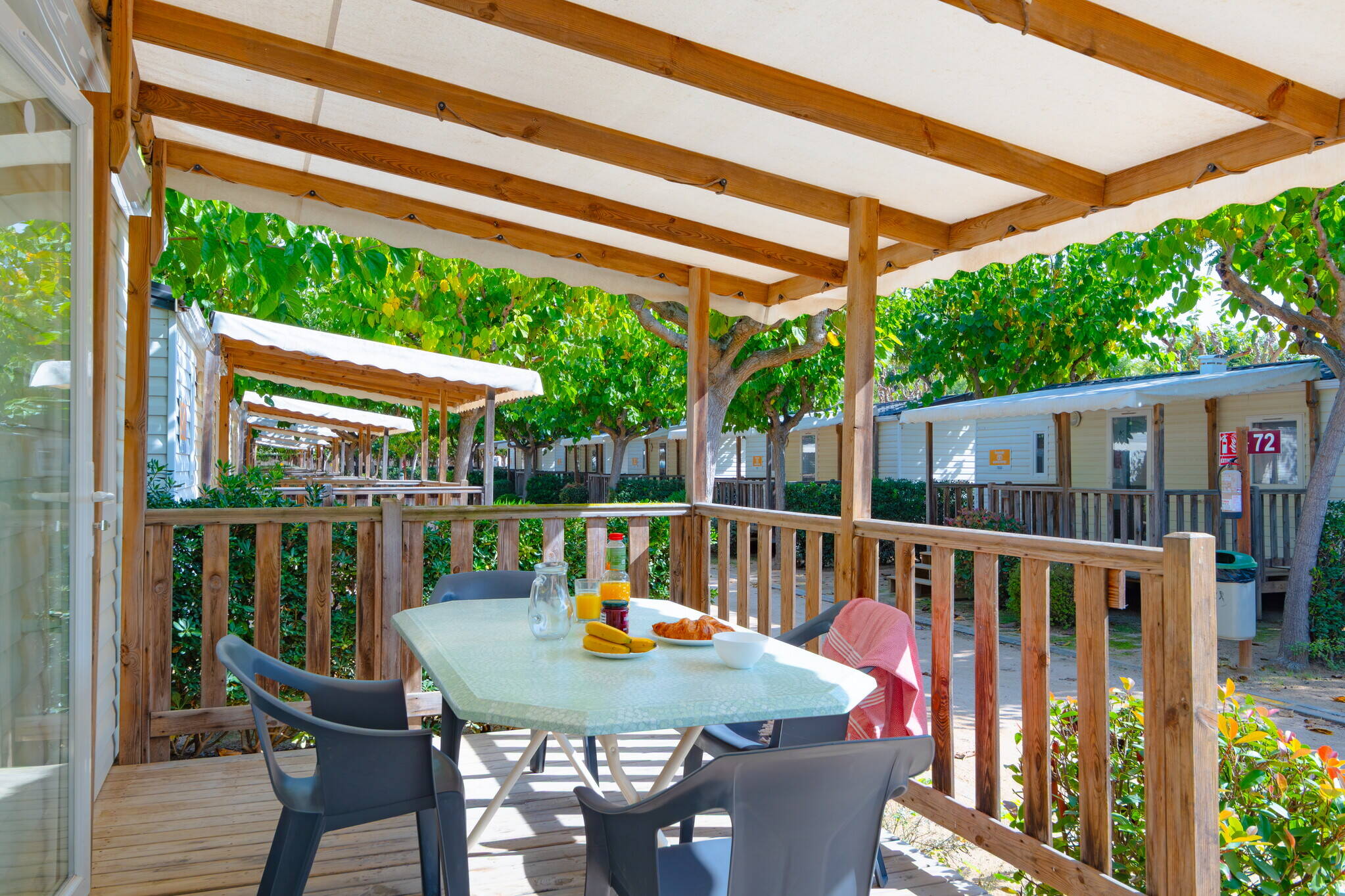Les mobil-homes, qui peuvent accueillir jusqu'à six personnes, sont confortables, spacieux et bien équipés. Vous avez donc tout à portée de main pour profiter d'un séjour reposant et relaxant. Chaque hébergement est équipé de la climatisation, donc il n’y a aucune raison de redouter de chaudes nuits sans sommeil. Vous pouvez aussi réserver un séjour dans l'une de nos tentes, qui sont également équipées de la climatisation et d'une terrasse couverte.