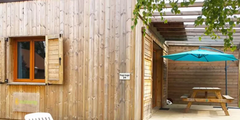 - Ground level or small integrated wooden terrace, With parasol or gazebo