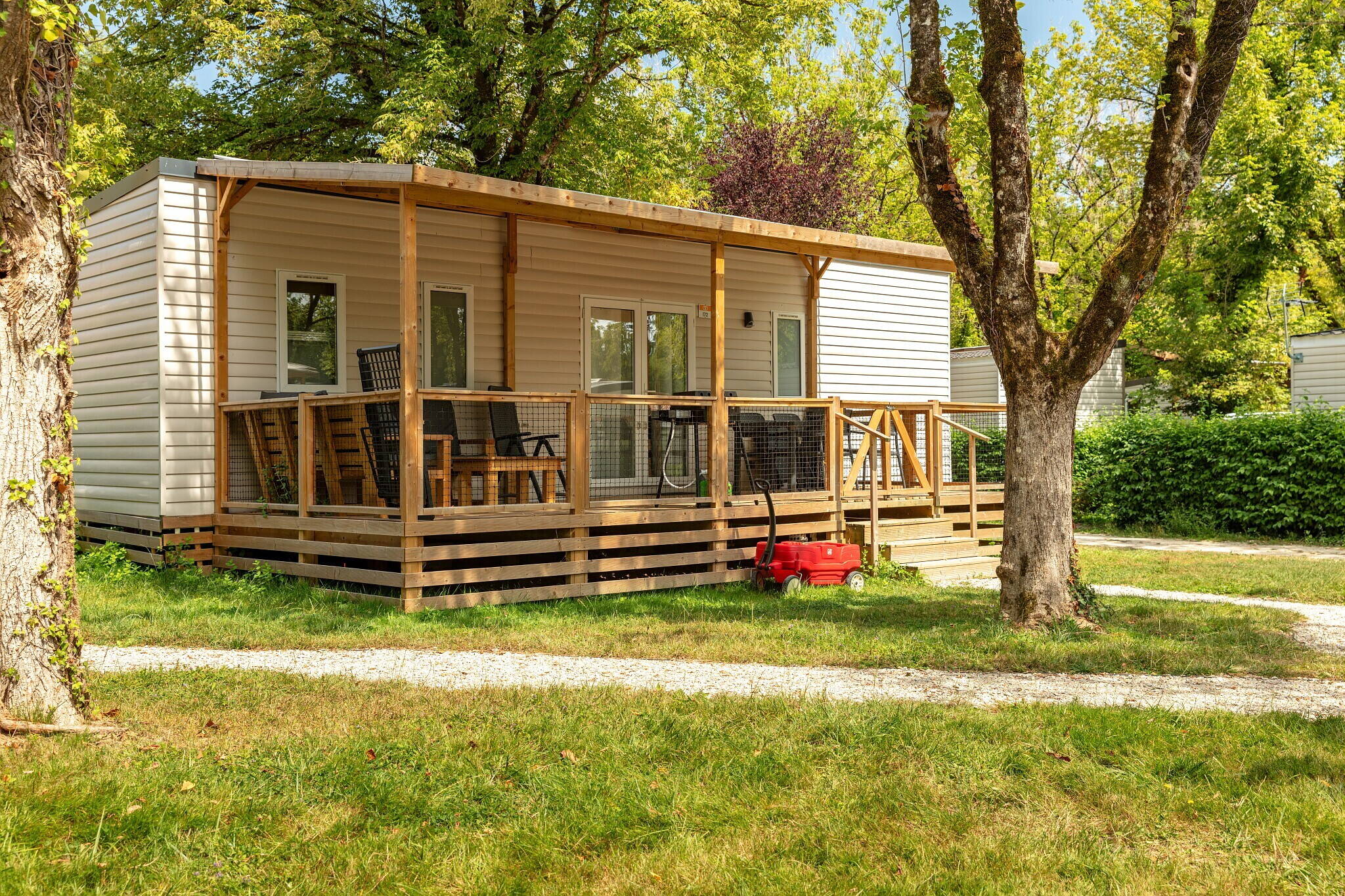 - Ground level or small integrated wooden terrace, partially or fully covered