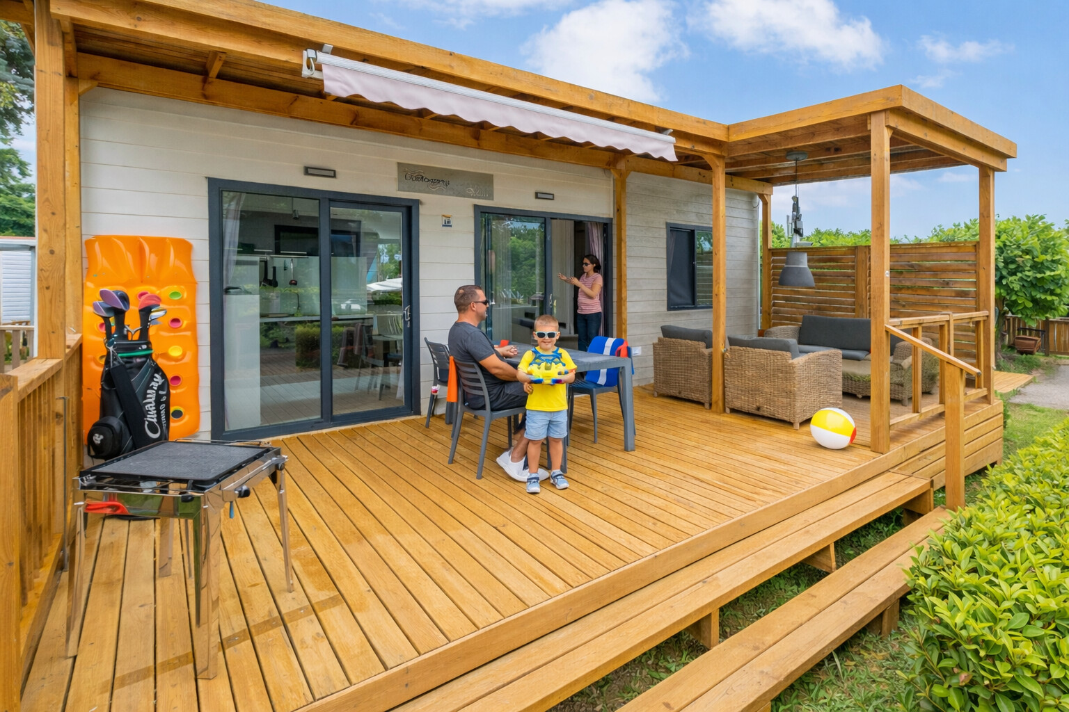 - Piano terra o piccola terrazza integrata in legno, Con ombrellone o gazebo