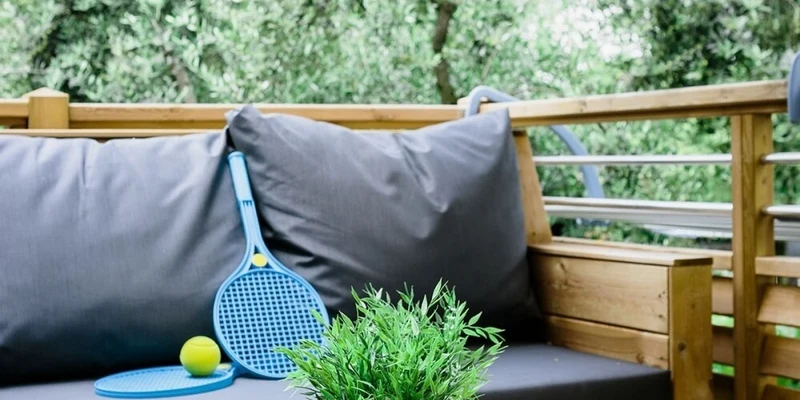 - houten veranda, met schaduwdoek