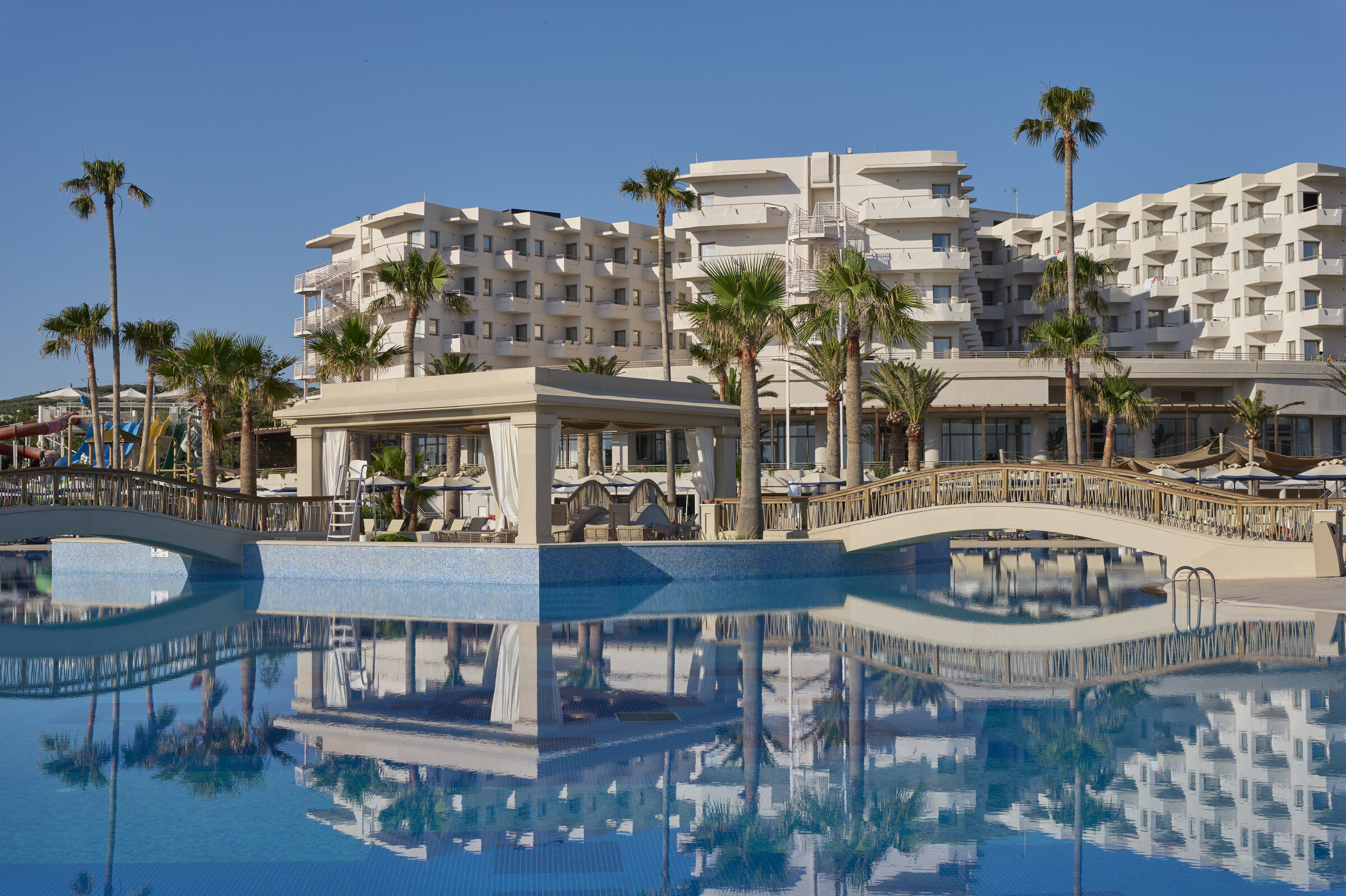 Meerdere zwembaden, met glijbanen voor kinderen
