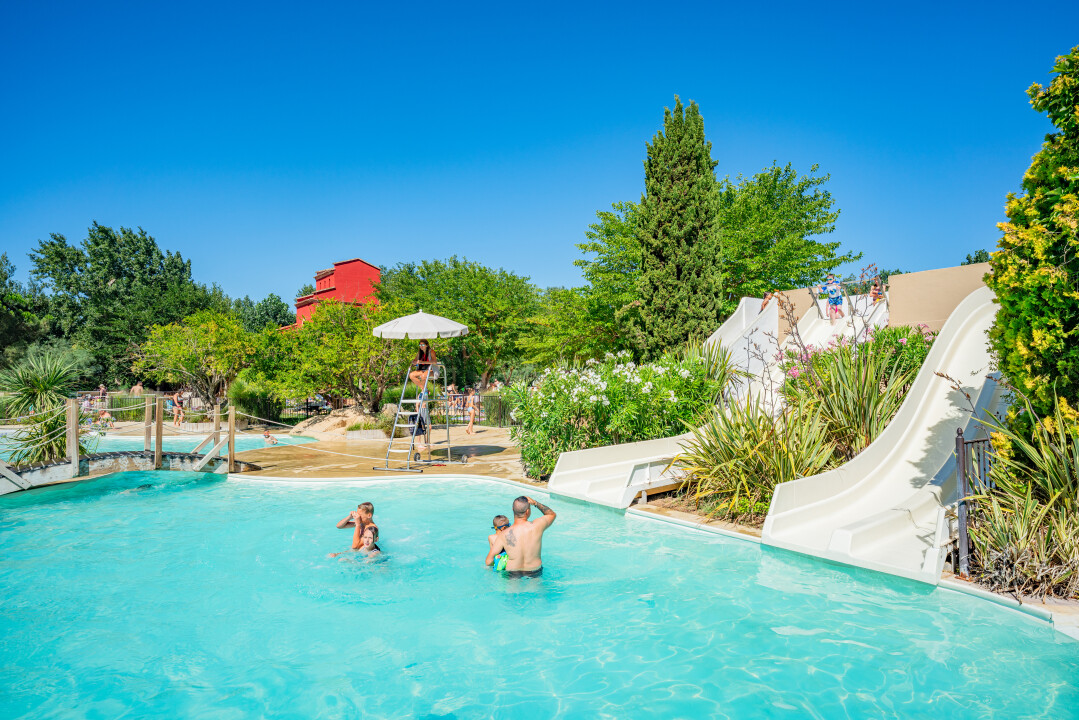 Groot zwembad, glijbanen en apart kinderbad