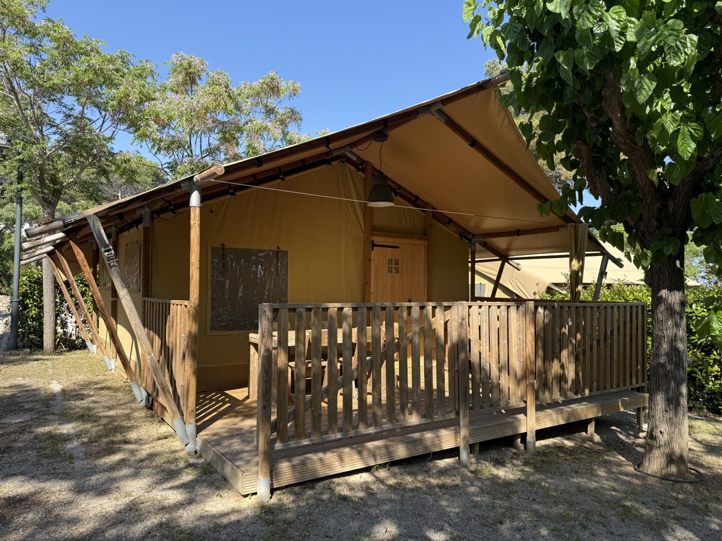 - Gruntowy lub mały zintegrowany drewniany taras, Z parasolem lub pawilonem
