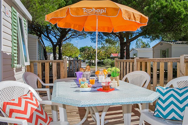 - Ground level or small integrated wooden terrace, With parasol or gazebo