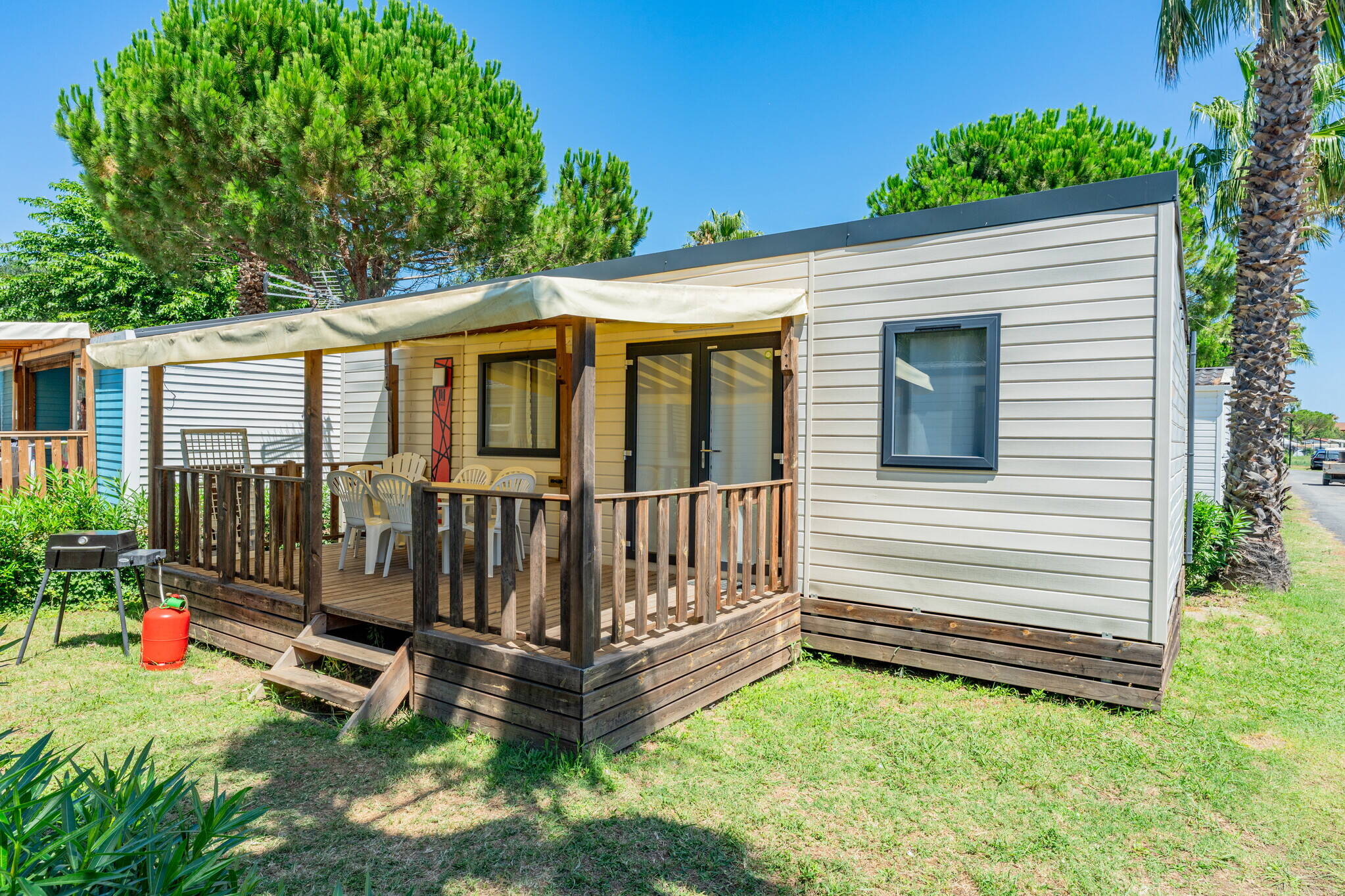 - Ground level or small integrated wooden terrace, With parasol or gazebo